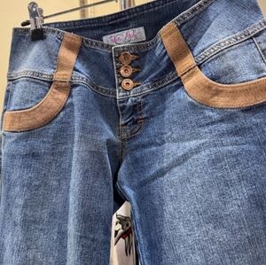 These Van Pierre straight leg bootcut jeans have brown leather-like accents at the front pockets as well as back pockets. These vintage Y2K era jeans are in EUC, measuring 14.5" laying flat. They fit like a 27" due to being low rise. 7" rise and 28" inseam.
