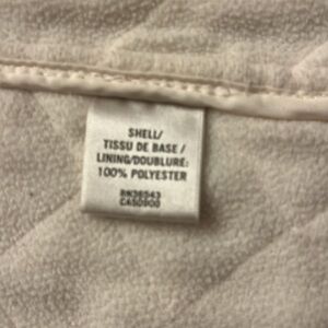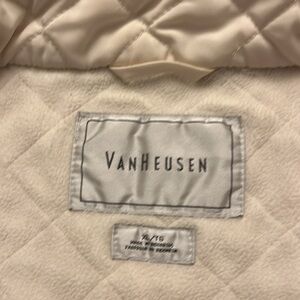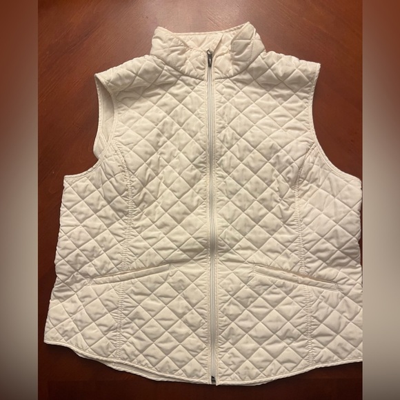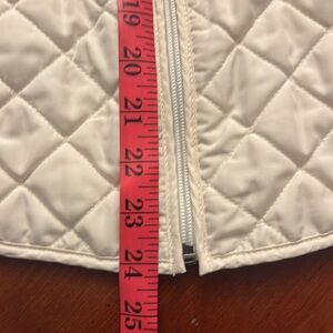 VanHeusen Quilted Women’s Cream Zip Up Vest. Fleece lining, 2 front pockets and high neck. This is a lightweight vest.