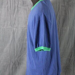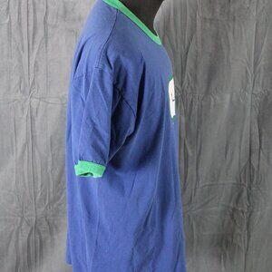 Up for sale is a retro Vancouver Canucks shirt. It is a ringer tee with a blue base colour and green trim. The front of the shirt has the Canucks' stick in rink logo screened on. What a great shirt do not miss out on it.