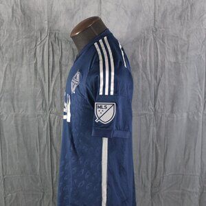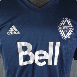 Up for sale is a retro Vancouver Whitecaps jersey by Adidas. It is a 2015 away jersey with a blue base colour and silver trim. The front of the jersey has the Adidas logo stitched in with the Whitecaps and team sponsor Bell logos crested on. Each sleeve has the MLS logo crested on in silver. The back of the jersey is blank so it could be personalised. What a great jersey do not miss out on it.