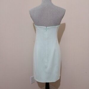 This listing is for a Vandi Crystal Mini Dress by Jonathan Simkhai. This beautiful little strapless dress features a sequin embellished bust, draped neckline, and notched hem. It's made in a mid-weight crepe fabric and has a light satin lining of the same colour. The colour name is Seafoam, which is variously described as teal, green, or blue. The dress closes at the back with a hidden zipper, secured at the top by a hook and eye. There is also gripper tape around the inside of the neckline to help keep the dress in place.