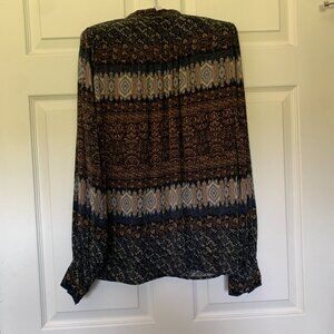 Black multi-coloured peasant blouse with blue & brown paisley abstract print. Not sure of the exact pattern name, but I do know it's the same as the Santana Dress and Fadia Skirt. With 4 buttons at the collar for a more open, boho look. Billowy long sleeves with small gap and 2 buttons at cuff.