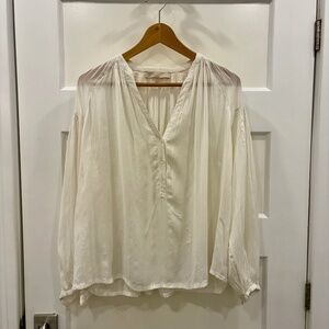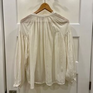 This top combines a V-neck and long sleeves. It stands out thanks to its lowered armholes and enhanced by a beautiful play of gathers to bring volume. The buttoned cuffs are embellished with small flat pleats. A blouse with chic details, perfect over trousers or shorts. Nipoa blouse in shaped cotton voile. V-neck in Tunisian effect with buttoned placket. Long buttoned sleeves. Gathering details on shoulders and collar. Slightly transparent.