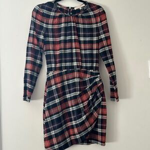 Cotton and wool plaid dress with side zip, hits around the knee.