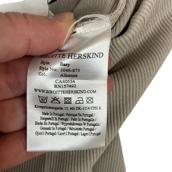 From the Vanessa Hong x Birgitte Herskind collab - these leggings are soft in comfortable ribbed jersey. High rise. Finished with stirrup style cuffs. The colour is "Alkanna", a nice neutral off-white beige. Made in Portugal. This collaboration seeks to take a more sustainable approach to the fashion industry and experiments with natural textiles and natural dyes from 100% waste products.