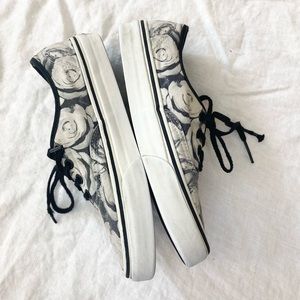The Digi Roses Authentic is a simple lace-up low top with a durable canvas upper, all-over floral print, metal eyelets, Vans flag label and Vans Original Waffle Outsole.