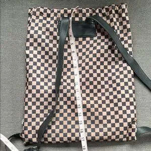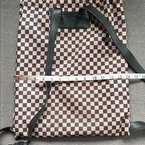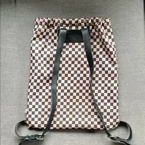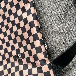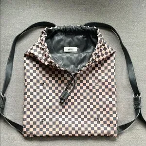Beige and black vans checkered drawstring bag. I believe there’s a pocket of some sort that buttons on to the front that is unfortunately missing. Other than that it’s in excellent condition.