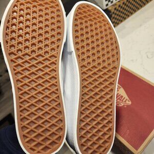 Haven’t been worn. Just slightly too big for my feet. Timeless white slip-ons. Iconic Vans design.