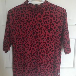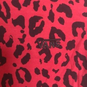 Red leopard print Vans Final Match mock neck tshirt. This material is a very soft and and comfortable cotton. The size xl however I am a size xs and it was fitting nicely and tucked into my pants. I am assuming it was sold as a crop top and this is why the xl fits as a normal xs tshirt.