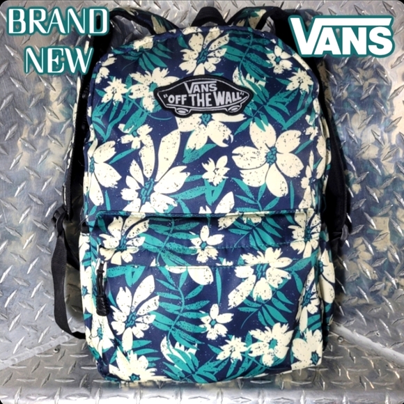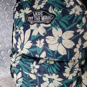Vans backpack with a vibrant floral design. Features a mix of blue, green, and white colors.