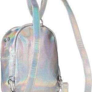 This Vans mini backpack is a stylish and functional accessory for any woman. The bag measures 7 inches in width, 9 inches in height, and 3 inches in depth, making it a perfect size for carrying your essentials. The exterior of the bag is made of durable polyester material with an iridescent finish that adds a touch of glam to your outfit. The bag features a zip closure to keep your items secure. The interior of the bag is lined with black polyester material, and it comes with shoulder straps for easy carrying. This backpack is perfect for any occasion, whether you're going to work, running errands, or attending a party. The Vans brand is known for its quality and style, and this mini backpack is no exception.