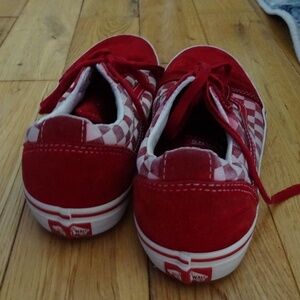 Vibrant red sneakers with classic checkered pattern. Comfortable and stylish for kids.
