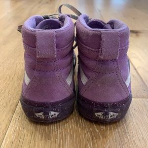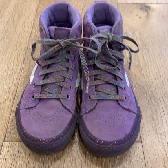 Purple suede Vans MTE all-weather hi-tops with purple sparkle sole. Came with silver laces that wouldn’t stay tied, so we swapped them for these rainbow colored metallic stretchy laces. There is no zipper up the back like other Vans high-top styles, and the tongue is partially attached, so these are easier to get into for a narrow or regular width foot. Super cute, gently worn, great for fall-mild-winter-spring!