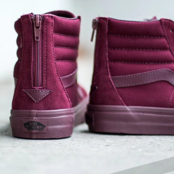 A deep maroon high-top sneaker featuring suede/canvas uppers, a tonal midsole, padded collar, and a zipper at the heel for easy wear.