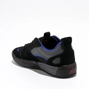A revolutionary low-top from Vans, the Mixxa skate shoe arrives in a solid black colorway with grey and blue accents offering a 90s-inspired design with modern materials. Featuring a sleek look with subtle branding, the shoe's upper features suede on the toe cap and heel, mesh on the sidewalls and toe box, and nubuck leather on the tongue and sides. Breathable and lightweight with exaggerated padding in the tongue and collar, the Mixxa combines retro style with practical function for a memorable performance.