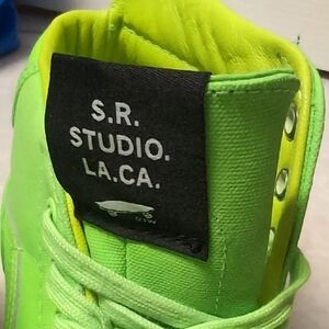 Bold neon green high-top sneakers with lace-up design from S.R. Studio. Eye-catching and stylish.