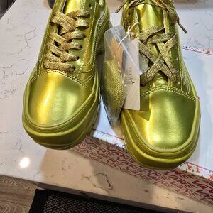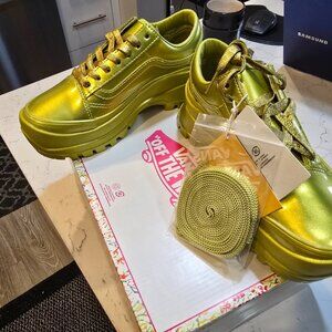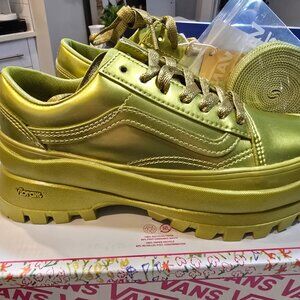 Vans X Collina Strada Citronelle Old Skool Vibram DX Sneaker from Vans. For Spring 2023, Vans is proud to partner with Collina Strada on a collection of footwear that reflects Collina Stradas core ethos of playful expression. Designed to highlight individuality and champion positivity, this shoes elevates the iconic Sidestripe shoe with an update to the classic silhouette, complete with an oversized Vibram outsole in metallic Citronelle. The matching metallic leather uppers complete the unexpected, monochrome look. Higher glossed foxing tap. Supportive padded collars. Cotton Laced. Ortholite sockliners. - Upper: Metallic Leather - Outsole: Vibram