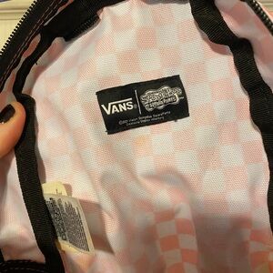 Charming coral checkered backpack with a fun face design. Ideal for school or play.