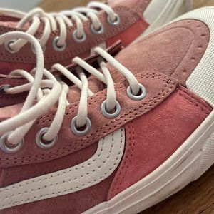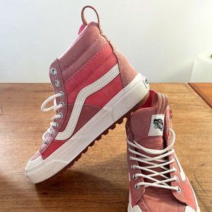 Vans Off The Wall two-tone pink high tops with white detailing. Heiq Eco Dry eco-friendly water repellent interior by Dupont. Essentially perfect condition, worn only once. Size 7.
