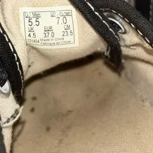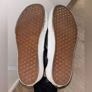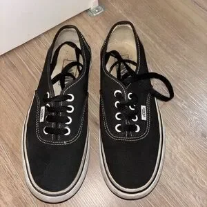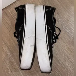 Sleek black canvas with white accents. Durable white soles. Iconic Vans style.