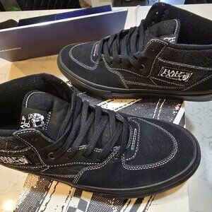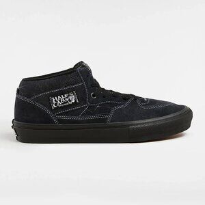 The product is a pair of Vans "Skate Half Cab Web" sneakers in black, designed for men with a US shoe size of 10. These sneakers feature a suede/canvas upper material and are part of the VANS Hal