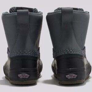 Practical, packable, and wear-at-the-bar-able, the Standard Mid Snow MTE is a downsized version of Vans’ best-selling Standard Snow MTE snow boot. With a waterproof vulcanized lower, waterproof seam-sealed construction, a Standard Snow MTE outsole featuring All-Trac™ all-terrain rubber, and a 100-gram weight insulation package, classic Vans style and day-to-day winter weather footwear have finally converged. This mid top boot features stretch gore at the opening, and is made with a mix of leather, suede, and synthetic materials. • STRETCH GORE: A lightweight and resilient stretch material has been added to the opening of the boot to allow ease of movement and easy on-and-off. • TRACTION: Specially designed for cruising around in cold weather conditions, the Standard Snow MTE outsole with All-Trac™, a cold weather-specific all-terrain rubber compound, offers next-level grip and traction. Featuring an aggressive reverse waffle lug pattern for variable terrain and street performance, and a siped tire-like design that increases overall traction. • INSULATION: Shoveling the walkway, walking the dog, or running to the market—we all want warm feet on a cold day, and the downsized 100-gram weight insulation package gets the job done. • MOISTURE MANAGEMENT: A vulcanized rubber lower and waterproof, seam-sealed construction provide an impenetrable leak guard.