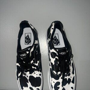 Step out with standout style in these Vans cow-print canvas sneakers. Featuring a bold black-and-white spotted design, this pair combines classic laid-back Vans flair with eye-catching aesthetics. Perfectly pre-owned and lightly used, they’re ideal for daily wear or adding a fun twist to casual looks.