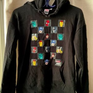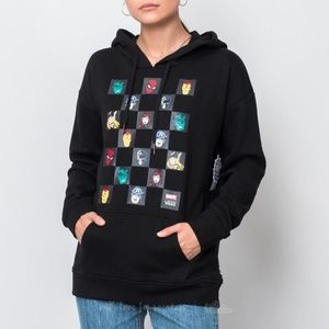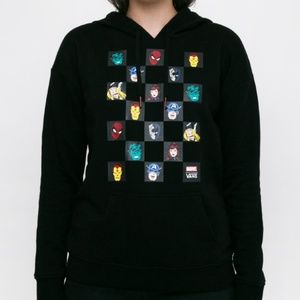 Vans x Marvel Avengers Women's Check Pullover Hoodie Sweatshirt Black in size extra small. (XS) Black in color with amazing Marvel graphics on the front, featuring all your favorite Avengers characters. This hoodie is a soft cotton blend in material. One pocket in front with a full hood and drawstrings. This item is a must have for the Vans/Marvel/Avengers fan and is perfect for wearing all year round!