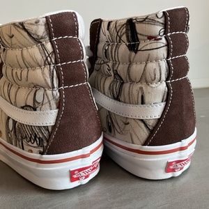 These OG SK8-HI LX sneakers are a collaboration between Vans and Javier Calleja, and the Turtledove canvas upper is fully printed in the globally-recognized artist’s character-based paintings. They feature a high-top silhouette, closed rounded perforated toes, brown suede trim, white leather stripes, a lace-up front, a quilted shaft lined in a white leather, branded insoles, and flat waffle-textured outsoles with red stripes on the sides.