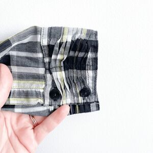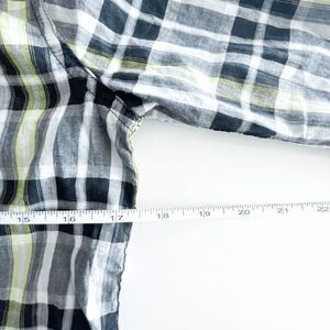 Make a statement with this stylish Vans Women's Button Down Shirt. Featuring a bold plaid pattern in eye-catching shades of yellow and black, and a ruffle down each side of the placket, this shirt is sure to turn heads. Fairly lightweight, almost semi-sheet. The long sleeve collared design adds a touch of class, while the soft and comfortable material ensures you'll feel your best all day long. Available in medium size, this shirt is the perfect addition to any fashion-forward woman's wardrobe. Cute pleating detail on cuffs.