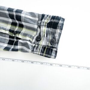 Make a statement with this stylish Vans Women's Button Down Shirt. Featuring a bold plaid pattern in eye-catching shades of yellow and black, and a ruffle down each side of the placket, this shirt is sure to turn heads. Fairly lightweight, almost semi-sheet. The long sleeve collared design adds a touch of class, while the soft and comfortable material ensures you'll feel your best all day long. Available in medium size, this shirt is the perfect addition to any fashion-forward woman's wardrobe. Cute pleating detail on cuffs.