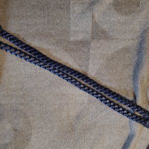 Navy blue faux leather, braided handles. 23” long x .75” wide, with an 11.5” handle drop.