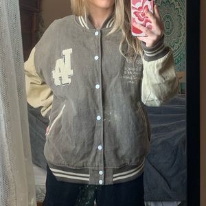 Worn once, amazing quality. This jacket is very thick and will keep you warm. Has super cute designs and has pockets as well. Jean-ish material.