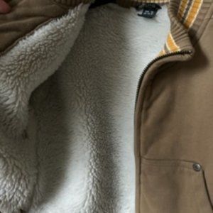 Thick, sherpa lined tan and yellow varsity jacket for 1.5 -2 year old. Zipper closure. Pocket detail on one arm.