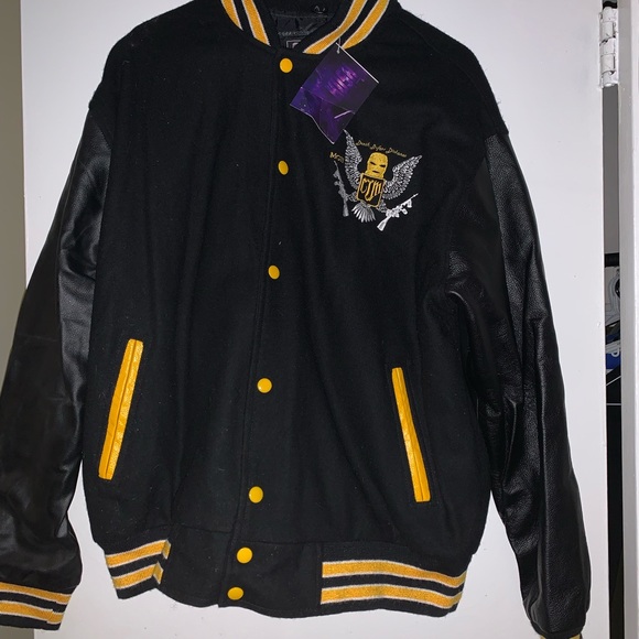 Varsity jacket with leather sleeves brand new never worn before has tags on it size large