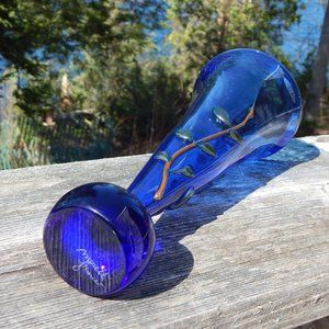 Vase, Vintage Blue signed Moretti with glass vine, flower details in relief