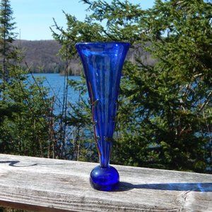 Vase, Vintage Blue signed Moretti with glass vine, flower details in relief, About 18", Pedestal