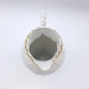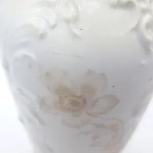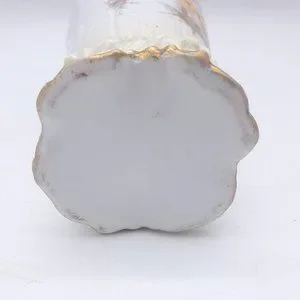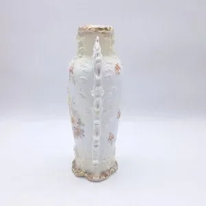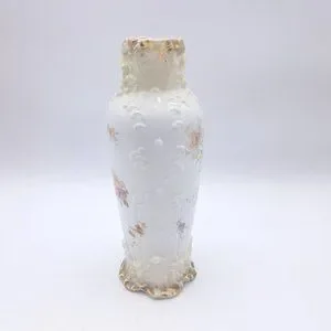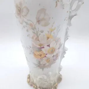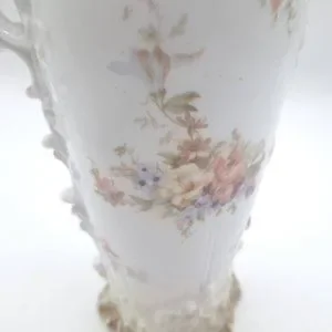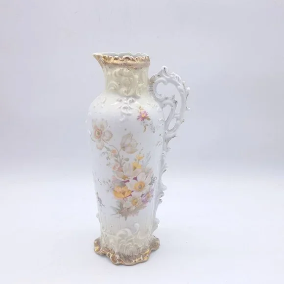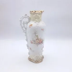 A vintage vase or pitcher that was sold to me as -and certainly looks like- a Rudolstadt vase but without markings. It is decorated with gold on its feet and neck and has multi colored bouquets of flowers; there are no cracks, chips or crazing. It is 10 1/2" tall and 3 1/4" at its widest without the handle.