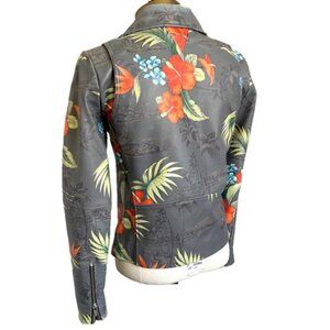 Veda Gray Tropical Print Leather Biker Jacket - Small