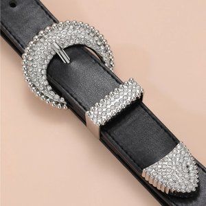 Vegan Black Leather Rhinestone Round Buckle Belt