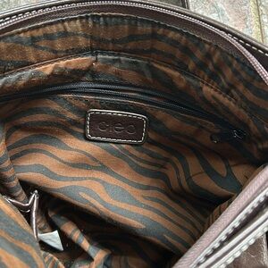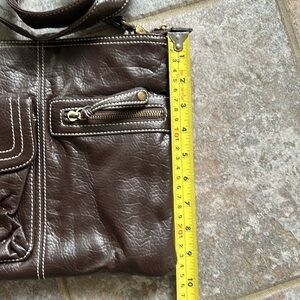 Stylish brown vegan crossbody purse with cream stitching. Adjustable and removable strap. Strap can go longer by another 2”. One side has small zipper pocket and cell phone snap close pocket. The other side has open pocket with large zipper compartment with card holders and another zipper compartment. Zipper top and inside there are two open pockets and one zipper pocket. Perfect for everyday use. See last pic for small peel which is not visible as it is within the flap of the top zipper. Otherwise in very good condition.