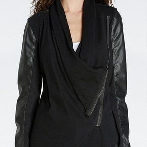 The Vegan Leather and Ponte Jacket features a draped front, vegan leather sleeves, and silver zipper detailing. Easy to wear with dual functionality! Perfect piece to layer with every look.