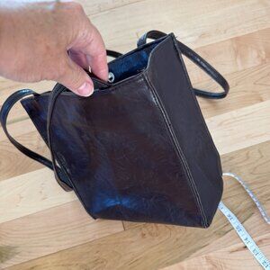 Discover your new favorite everyday bag! This gorgeous brown vegan leather tote has a unique, fun lunch bag shape that's both fashionable and practical. The spacious interior is perfect for carrying your phone, wallet, keys, and more, making it a super versatile accessory. The comfortable 11" loop handles make it easy to carry on your arm or over your shoulder. Whether you're heading to the office, a coffee shop, or just running errands, this bag is a must-have. Dimensions: Height: 10" Width: 9" Depth: 4" Handle length: 11"