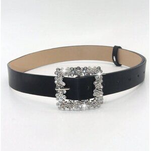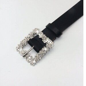 Vegan Leather Rhinestone Decor Metal Square Buckle Belt