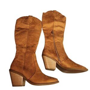 Vegan Suede Western Knee-High Boots Cognac Brown Women's 7.5
