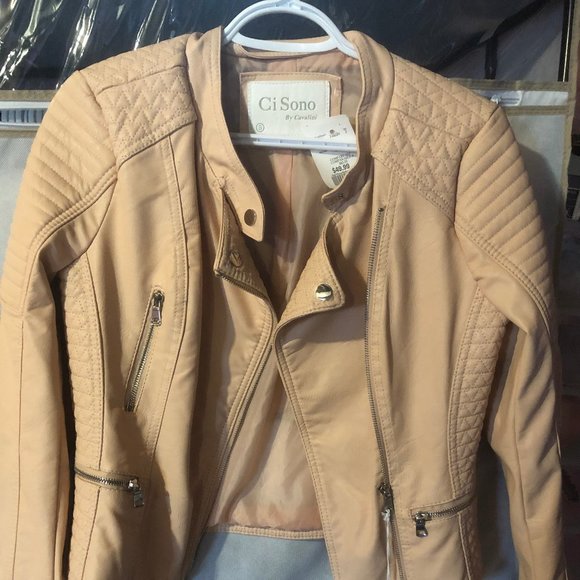 Ci Sono by Cavalini size small, blush vegan-faux leather jacket with biker-style stitching and zippers.