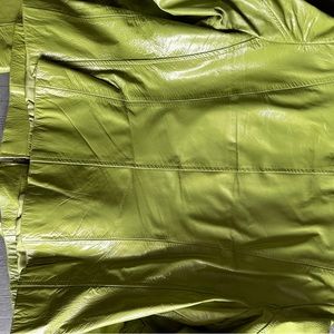 Chartreuse in colour vegan leather jacket. 22.5” in length, with detailed cuffs and front pockets. Lightly worn in good to fair condition
