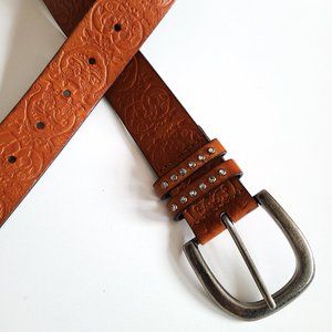 35'' long. No any marks, I assume it's not leather. Good condition.