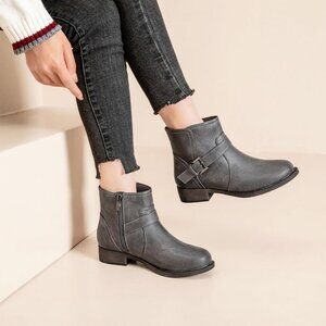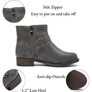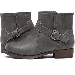 Veittes Women's Grey Comfort Slip On Low Chunky Heel Boot with Buckle Strap