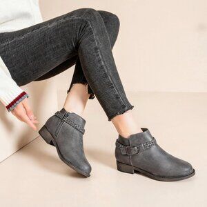Veittes Women's Grey Comfort Slip On Low Chunky Heel Boot with Buckle Strap